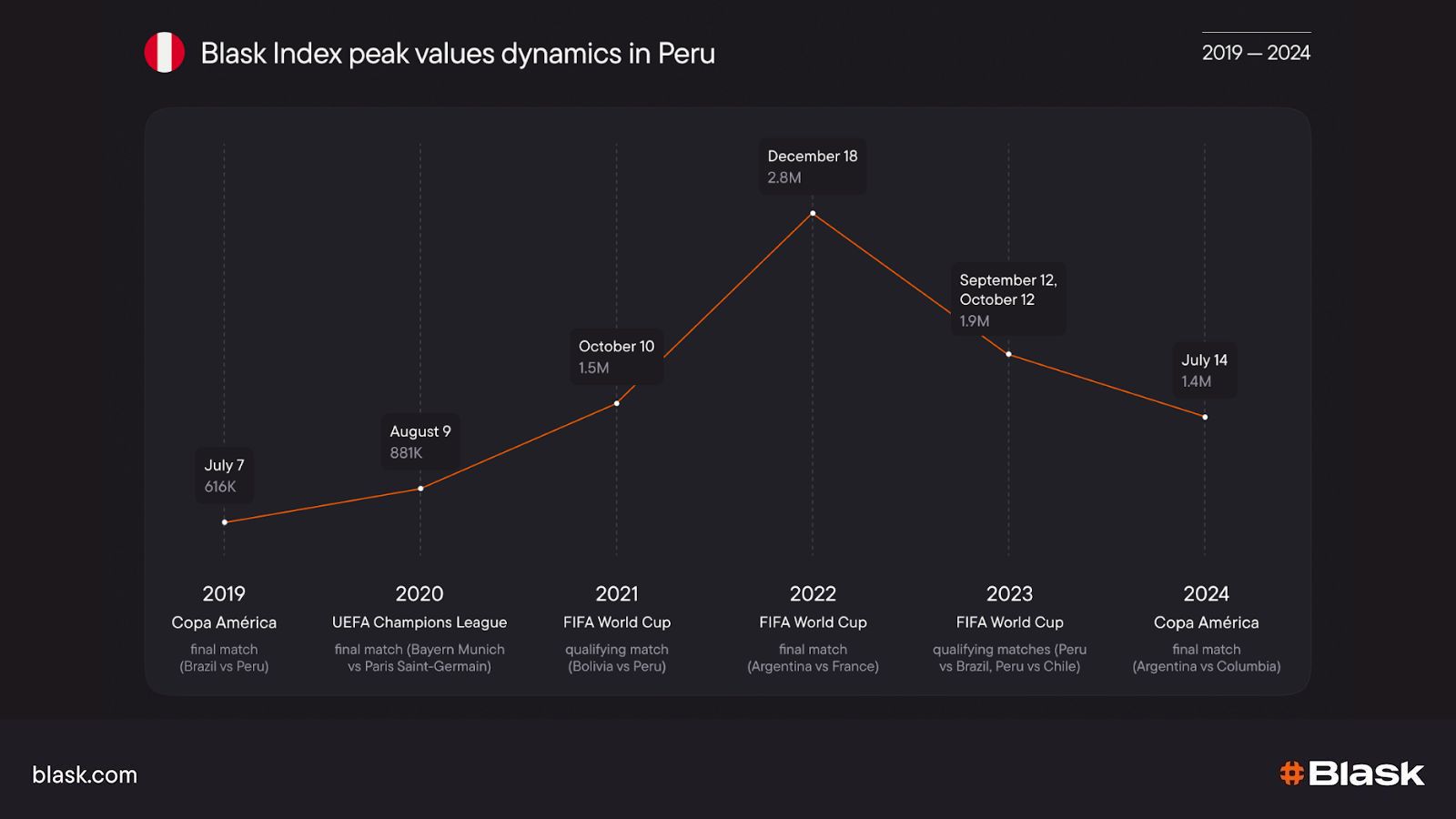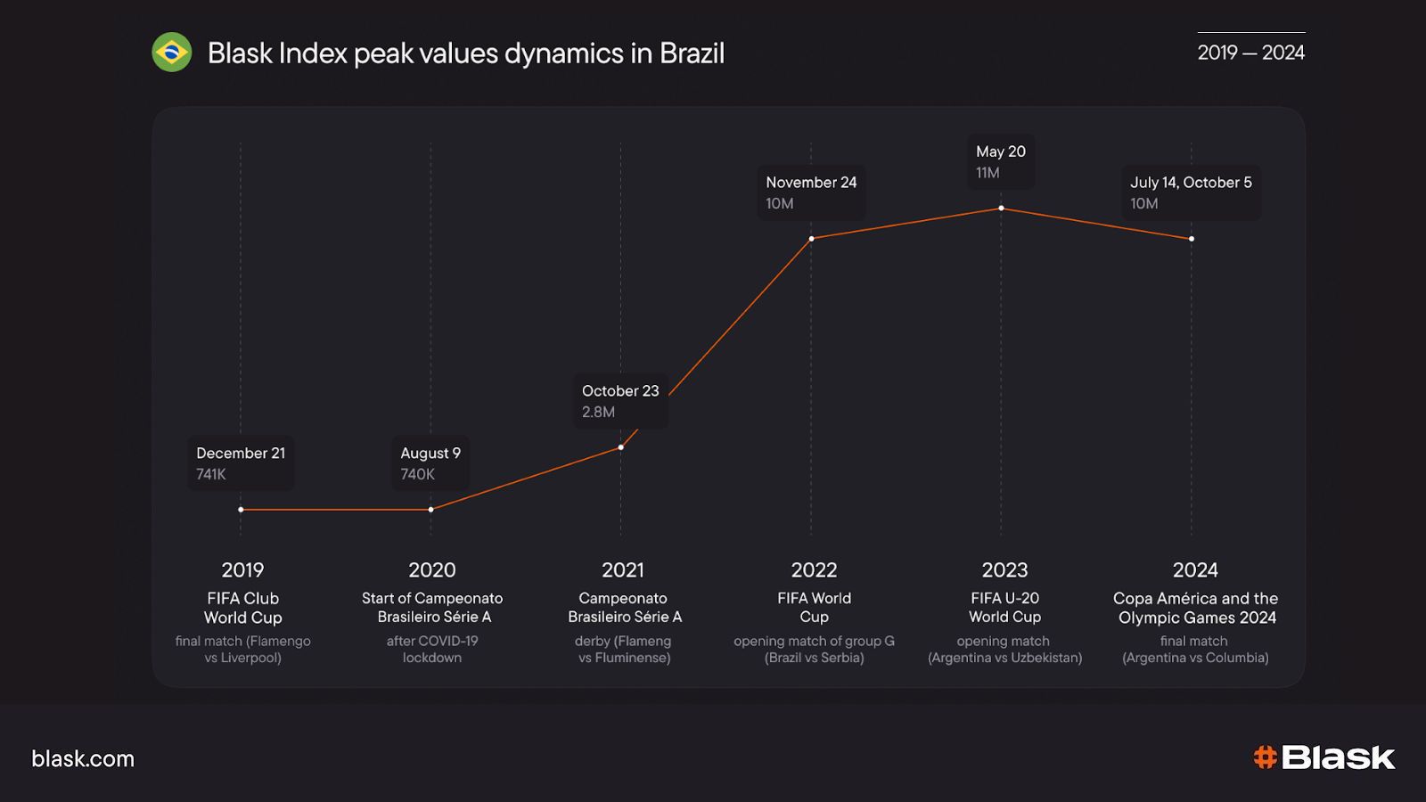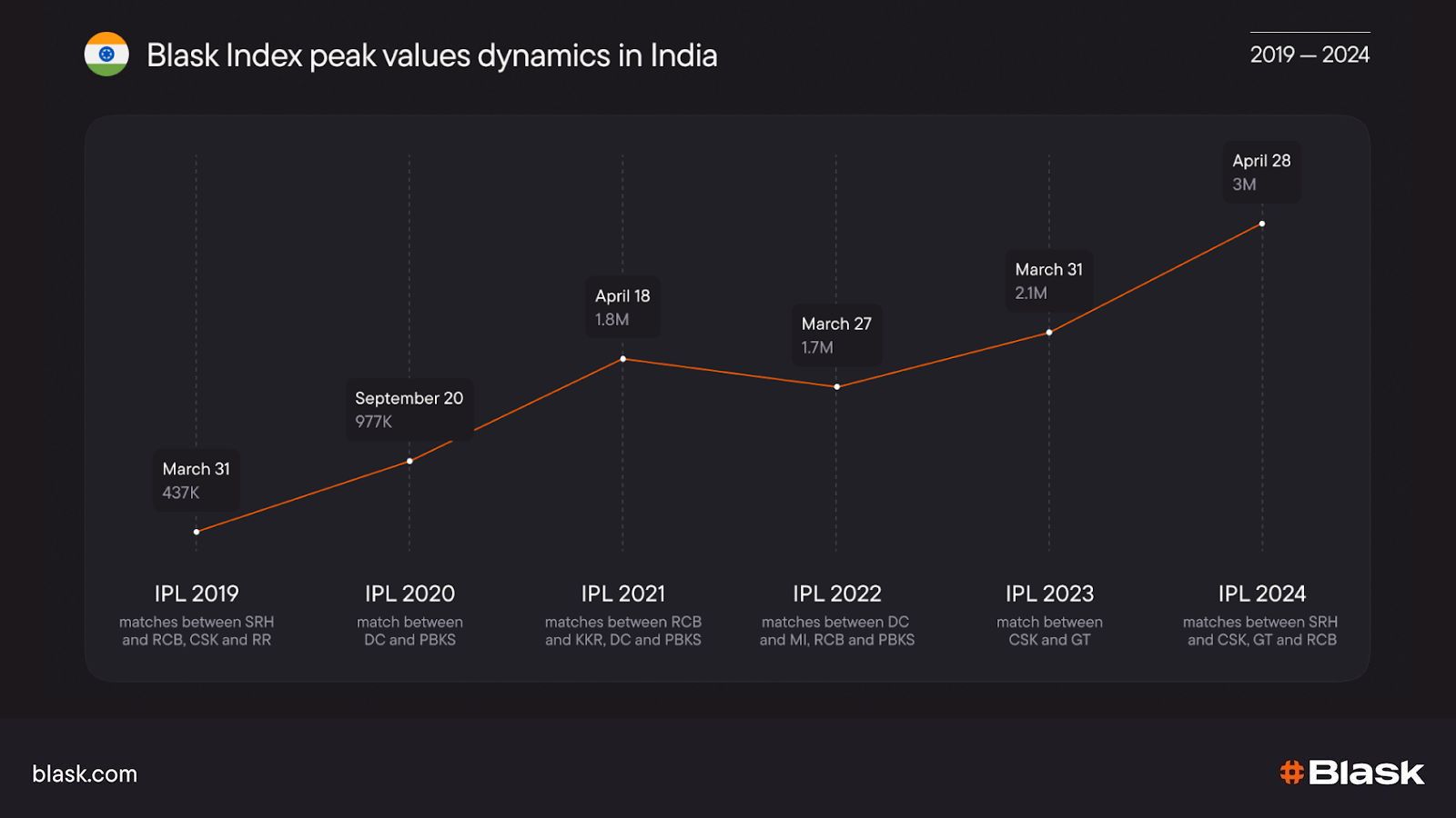 - Spot key spike-driving events — e.g., the IPL double-header in April 2024 hit ~3M on the Blask Index versus ~1M on typical weekdays.