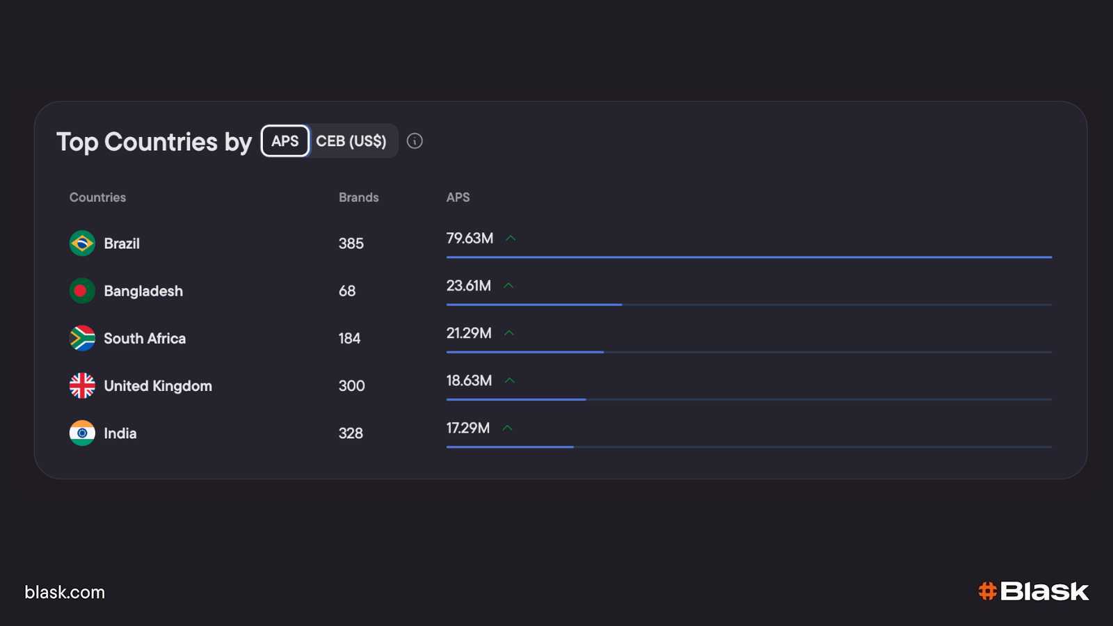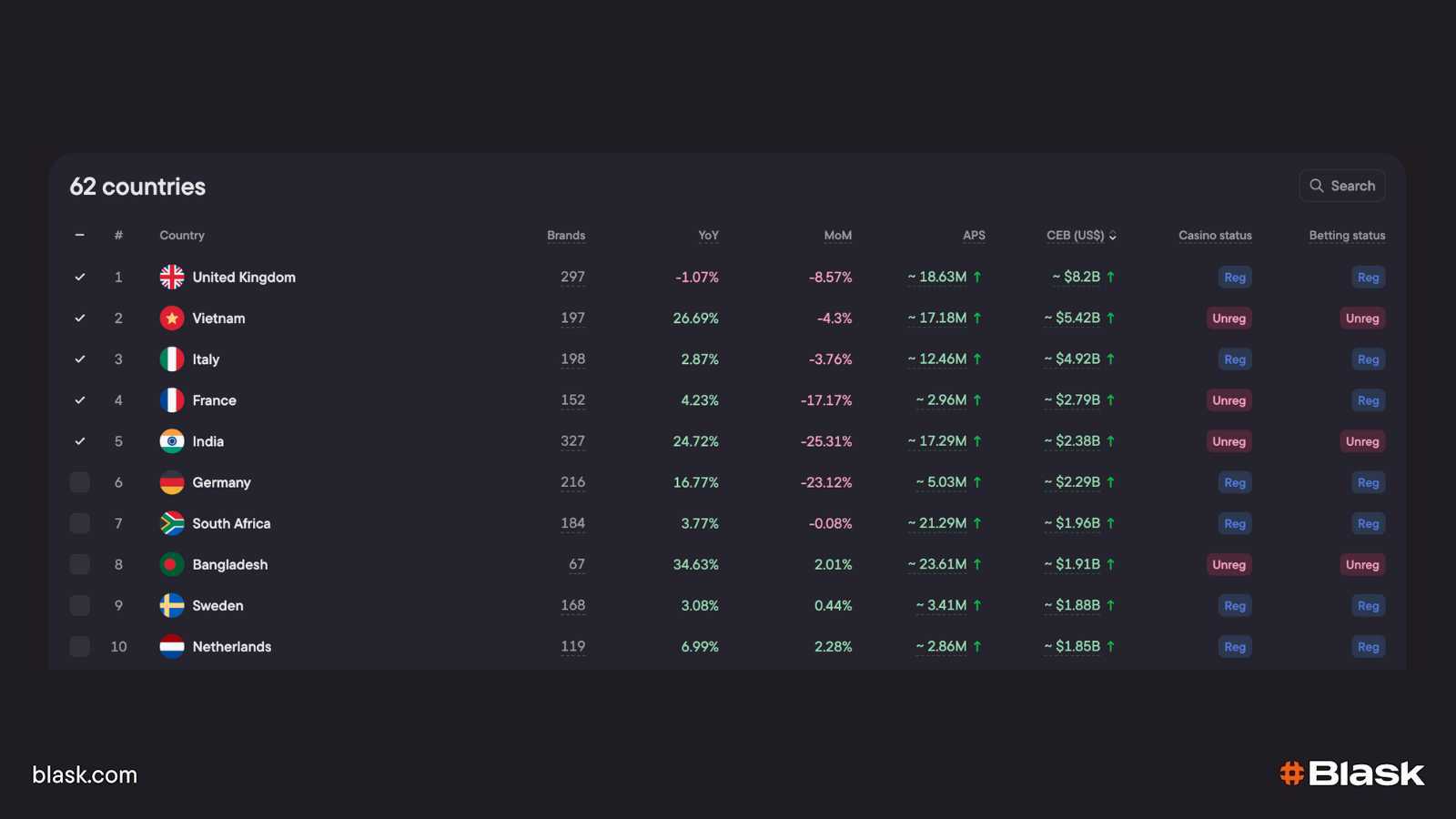 - Full market grid – The table that follows combines active-brand count, YoY and MoM Index growth, national APS, three-lane CEB revenue bands and licence status for every country Blask tracks.