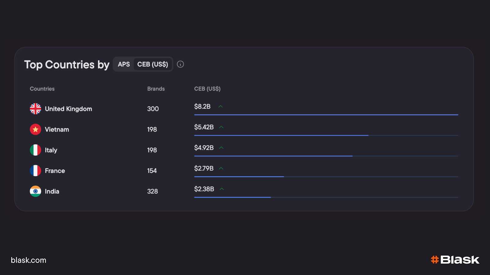 Open the Blask Countries dashboard and sort the table by month-on-month Blask Index growth.
