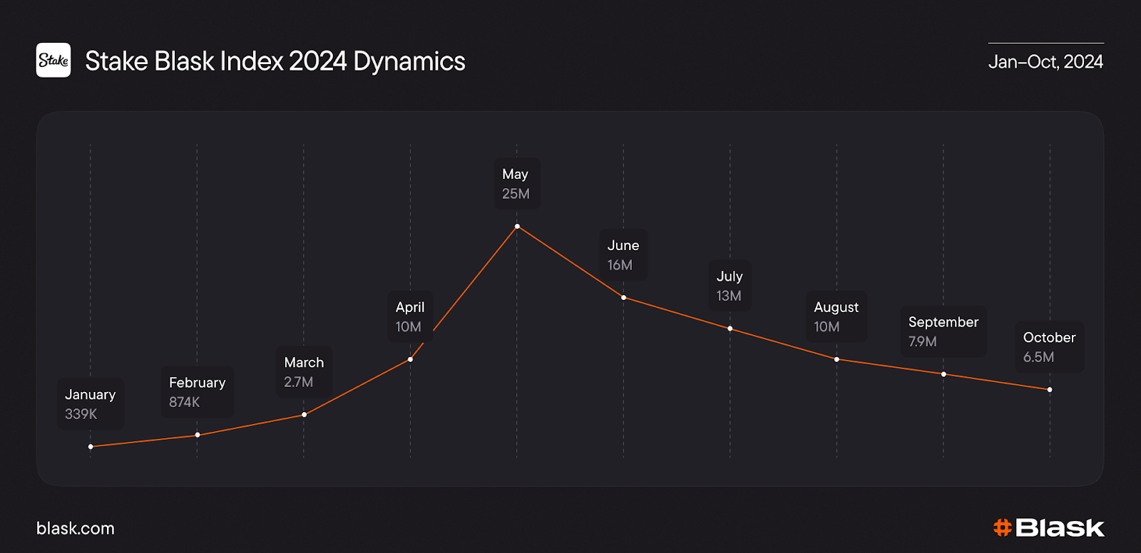 Stake: during IPL 2024, the curve leapt 2.7M → 25M after the “Early Six, You Win” promo plus INR deposits, lifting Stake’s Relative Market Share near 40%.